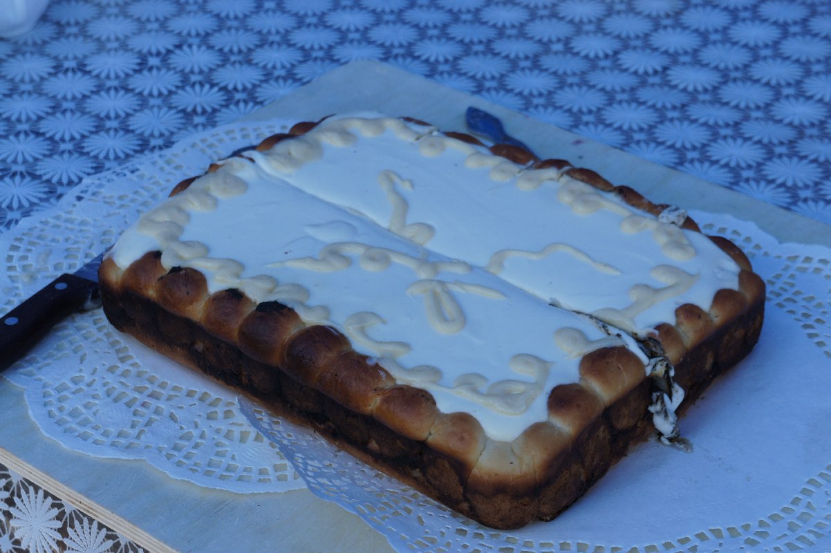 For lunch stewed pork with mushrooms and herbs in the cauldron was cooked. Salad with home vegetables with Adygei cheese was cut with garlic sauce. Also, cutting from spicy lard, smoked bacon and pepper basturma was made. For the tea croissants with apples and chocolate were baked.