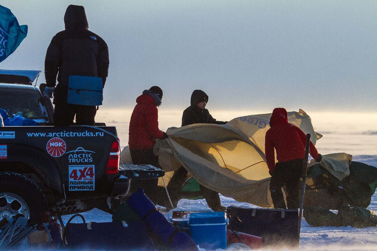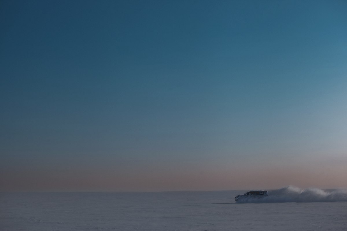 Monotonous movement along the ice is diluted by contemplation of nature, communication, overcoming of cracks and jumps through ice hummocks. Every 60 minutes the column stops to warm up, take a photo and have a snack. Despite the fact that we spend 8–12 hours per day in the car, there is no opportunity to get bored.
