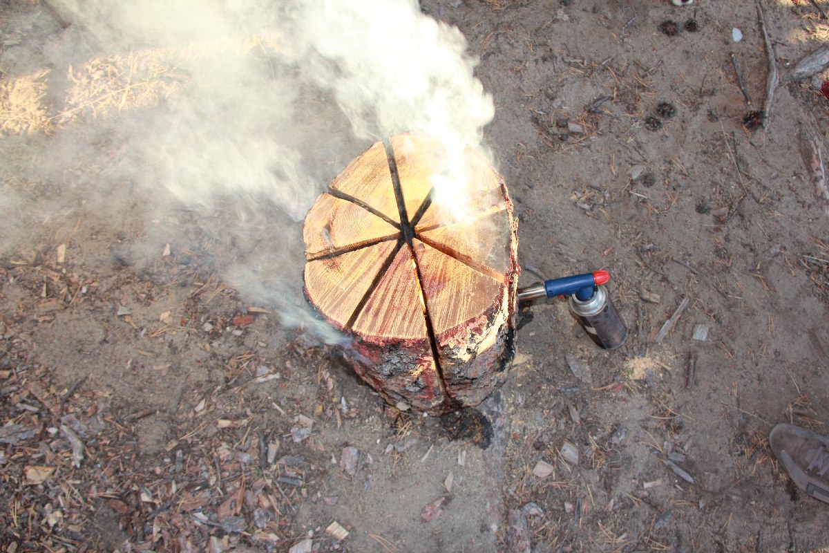 Traditionally, in Hakusy we cook the pilaf. First, we make a stove from a dry and flat log. It can be pine, larch or birch. We cut it into 8 equal parts, and do not finish cutting it to about 10 cm. This method is called a “Finnish Candle”. Further, the log is kindled inside and set on the leeward side.