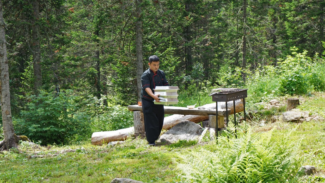 Пока колеса медленно карабкались вверх по камням и грязи, шеф раздувал угли для приготовления обеда. К полудню группа была у центрального коттеджа, где ее встретили местные старожилы — Сергей и Ася. Они повели гостей прогуляться к водопаду и горному озеру. Мы с помощницей и водителями готовили площадку к обеду: принесли стол, засервировали его, надули диваны, помогли шефу с грилем.