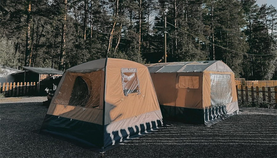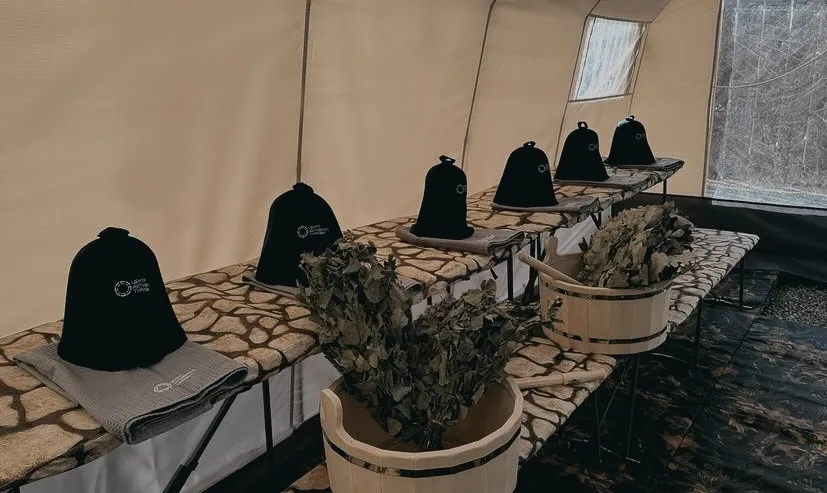 «Пена» — это мобильный спа-комплекс, который мы разворачиваем в шатрах в сотнях километров от города. Он вмещает до 30 человек. Это не просто походная палатка с печкой: мы создаем целое пространство с раздевалками, душевыми и зоной отдыха. Гости парятся на деревянных полках при уютном свете ламп, пьют травяной чай из самовара и слушают живую музыку у костра.