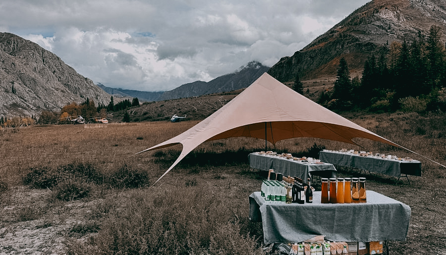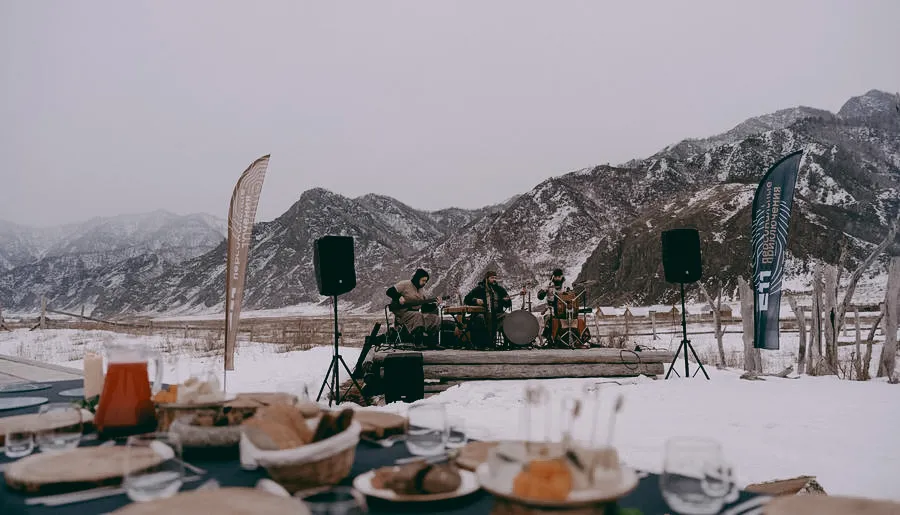 Рядом с баней всегда обустраиваем лаунж-зону. Это утепленный шатер с коврами, мягкими подушками и обогревателями. Здесь работает чайный мастер, который не просто наливает чай, а проводит церемонию. Он рассказывает про традиции Сибири, дает попробовать разные сорта, готовит местные напитки вроде узвара из алтайского лопуха.