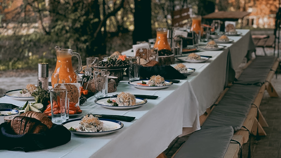 Кейтеринг становится естественным продолжением банного ритуала. Мы интегрируем услуги COLOS: от простых походных блюд до ресторанных ужинов с многослойной подачей. Гости после парения могут сразу перейти к ужину с бокалом просекко, где их ждут блюда из местных продуктов, приготовленные шеф-поваром.