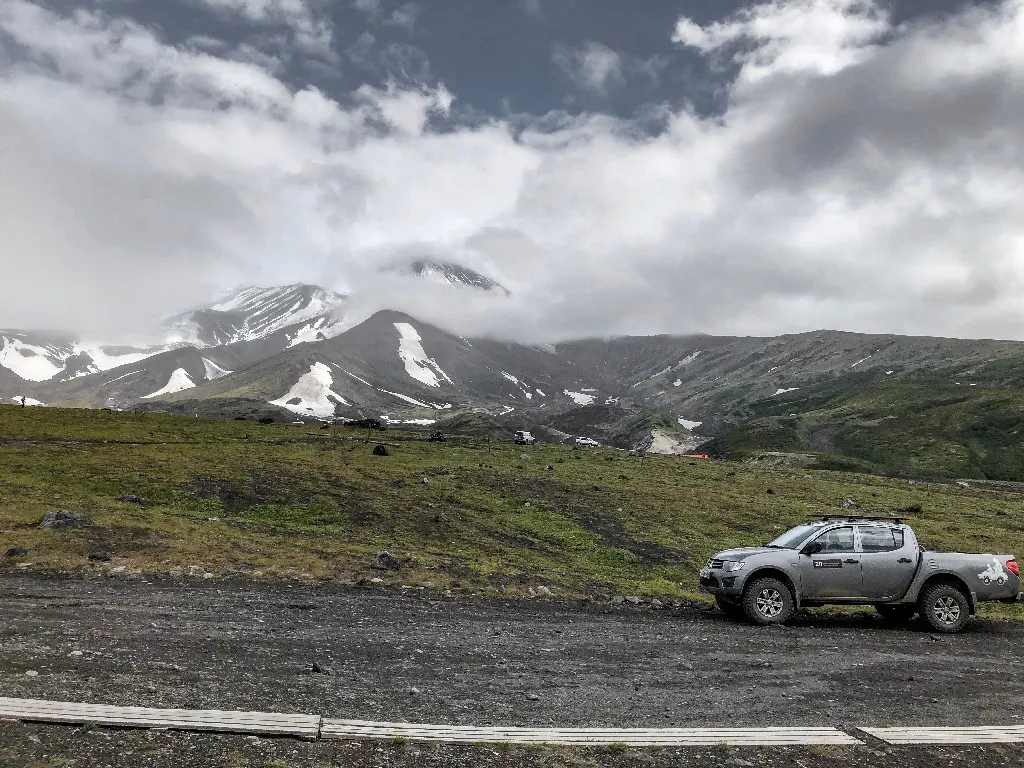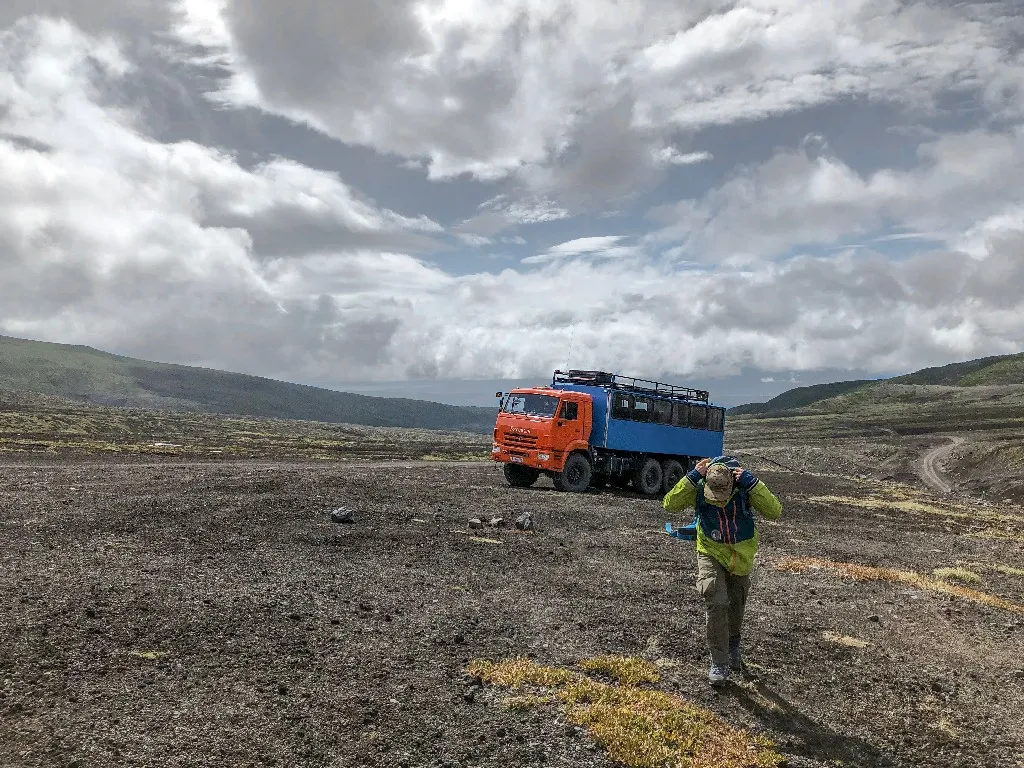 После завтрака, который закончился около десяти, к отелю подъехала вахтовка, на борту которой был самый известный вулканолог Камчатки, а может и России — Сергей Самойленко. Гости веселые, хорошо экипированные, с треккинговыми палками загрузились в Камаз и поехали гулять.