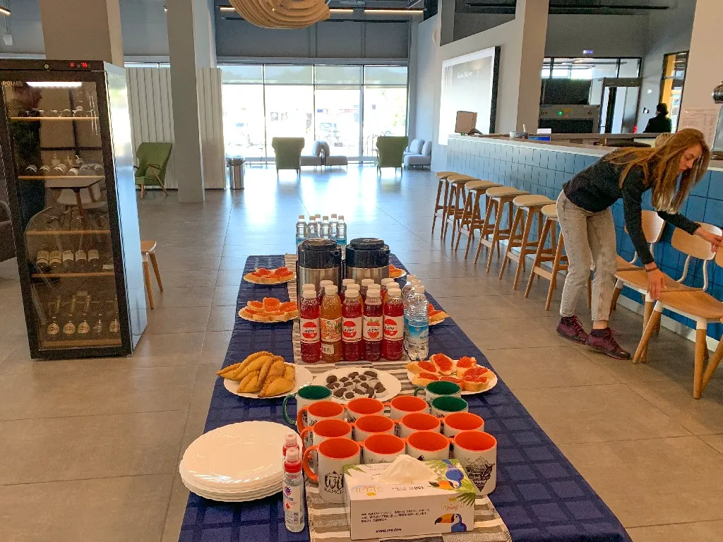 Мы встретили гостей в аэропорту небольшим фуршетом в бизнес-зале: чай, кофе, икра, пироги. И нам хотелось, чтобы этот приветственный фуршет длился как можно дольше. Дело в том, что у «Лагуны» не получилось обеспечить нам раннее заселение. Самое раннее, на что мы могли рассчитывать, это 14:00. Гостей мы предупредили заранее, и они были к этому готовы.