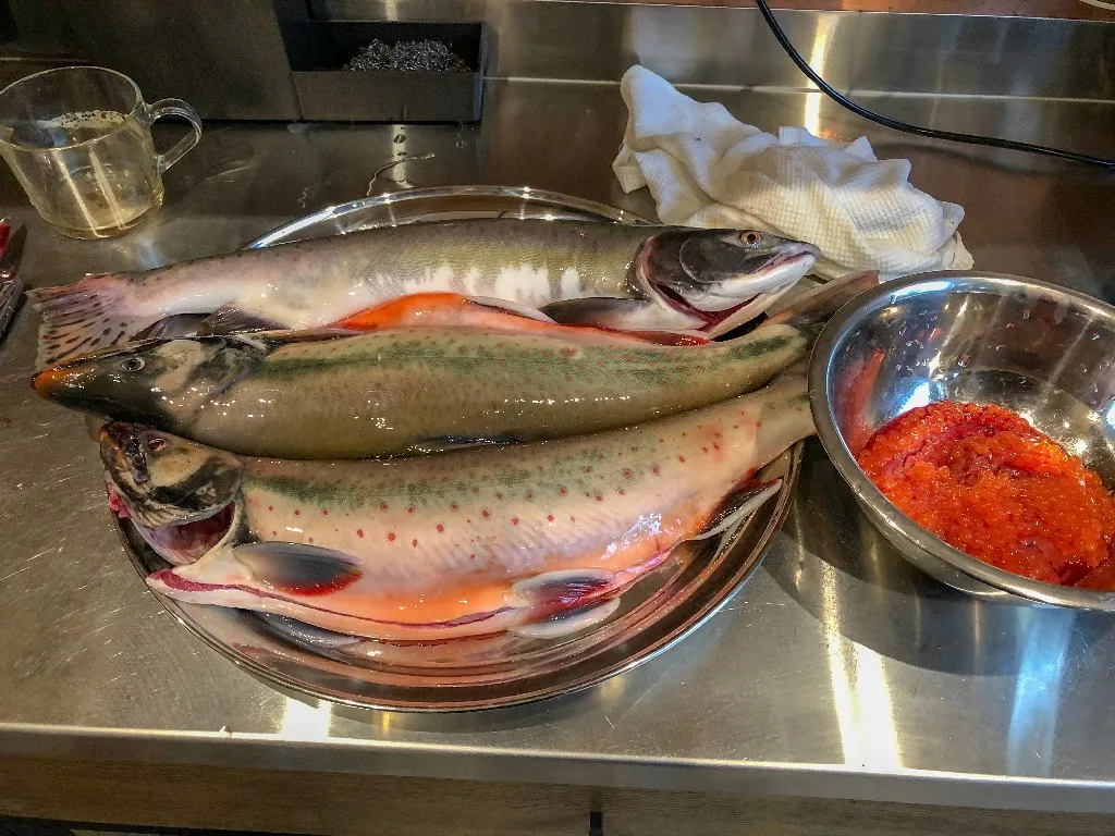 На ужин в дополнение к «Камчатской» похлебке, теплому салату с креветками и гребешком, приготовили свежевыловленного лосося и «пятиминутку» из икры.