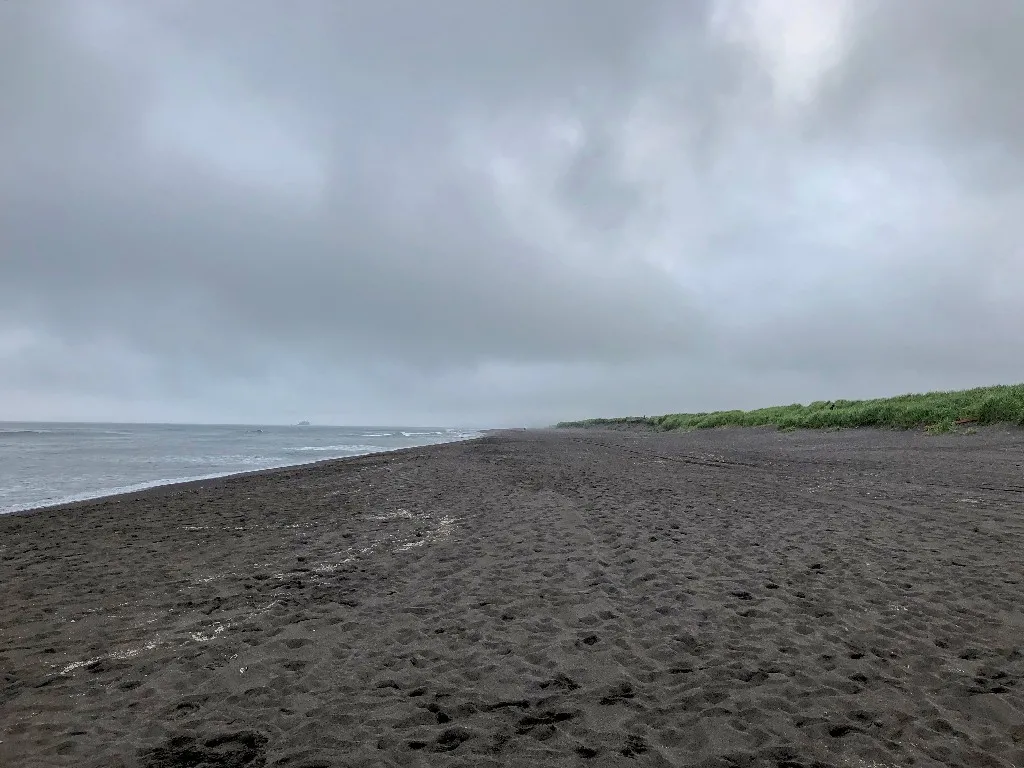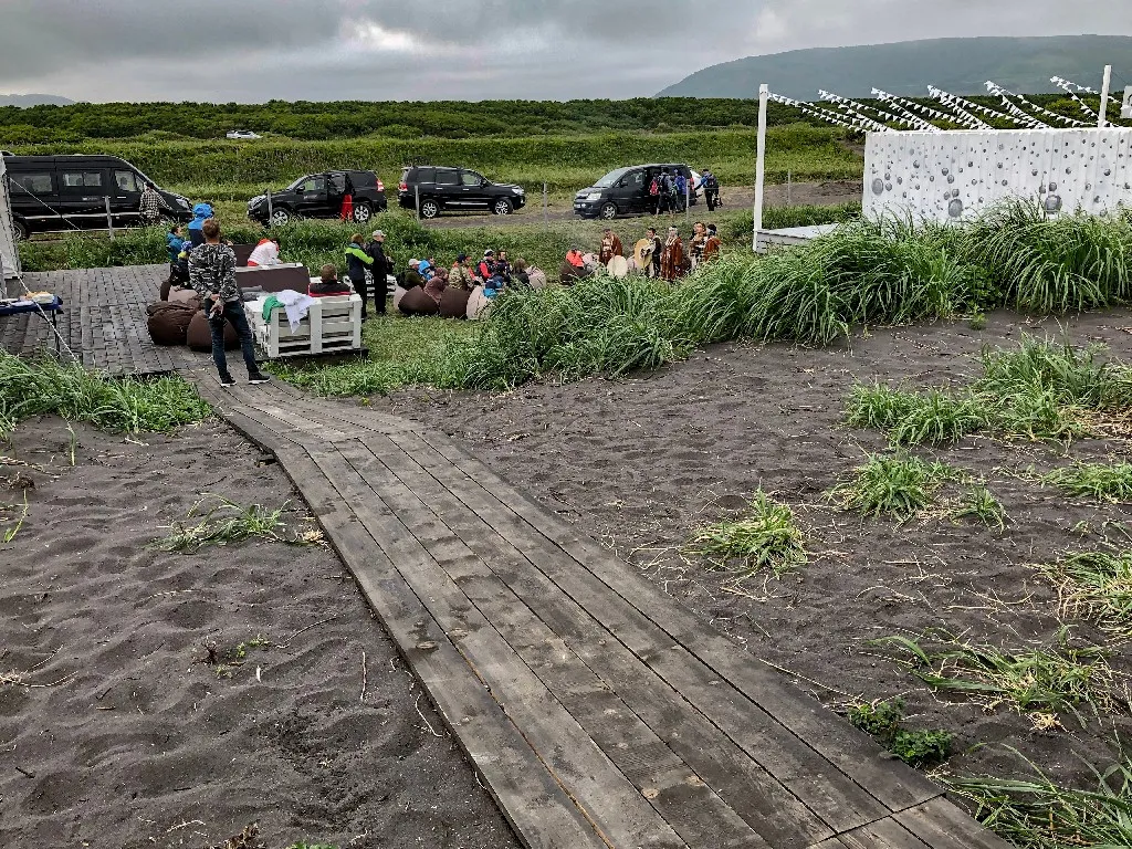 В 18:00 вся группа погрузилась в микроавтобус и поехала на океан. По прибытии прогулялись по черному вулканическому пляжу, кто-то даже искупался. После заварили иван-чая, сделали закуски и устроили небольшое представление с участием коренных жителей Камчатки. Посидели у костра, немного потанцевали и к ужину вернулись в отель.
