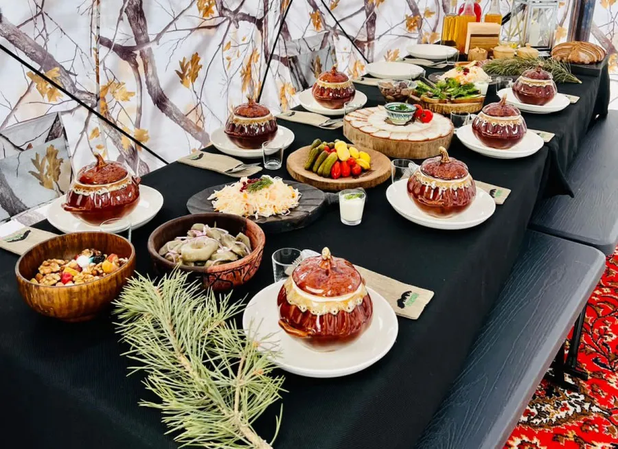 Одна из фишек кэмпа — кухня, основанная на локальных продуктах. Наша кухня укомплектована всем необходимым вам инвентарем: столы, посуда, столовые приборы, гриль, печь, газовые горелки. Кухня кэмпа работает в связке с профессиональной кухней в Иркутске, где все продукты и заготовки блюд проходят подготовку и обработку. Это позволяет нам готовить быстро, на большое количество гостей, с ресторанным качеством и сервировкой. Мы можем принять на обед до 50 человек.