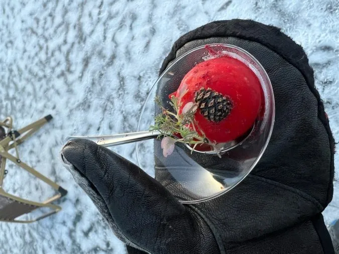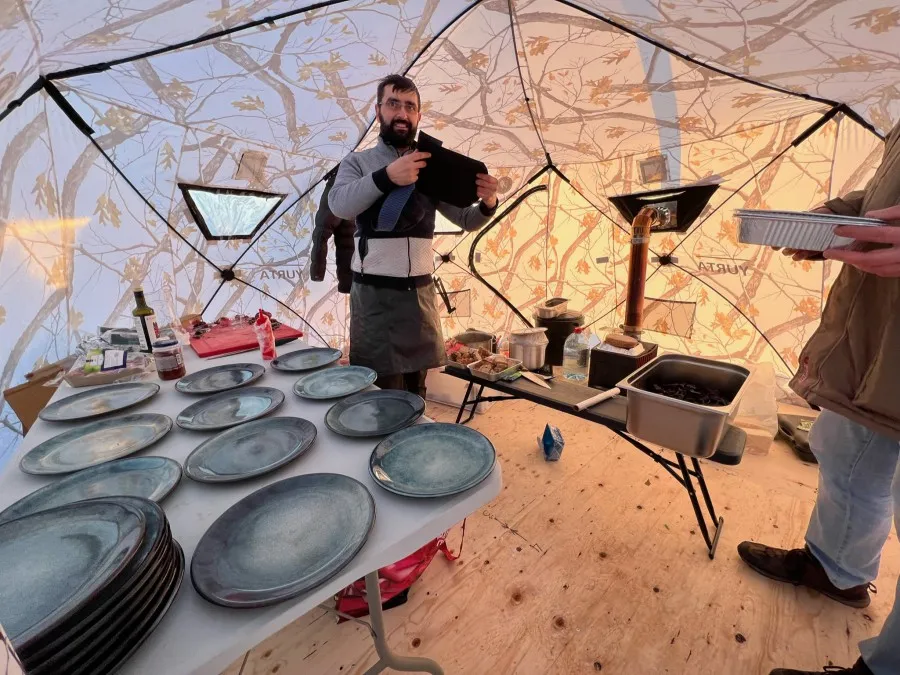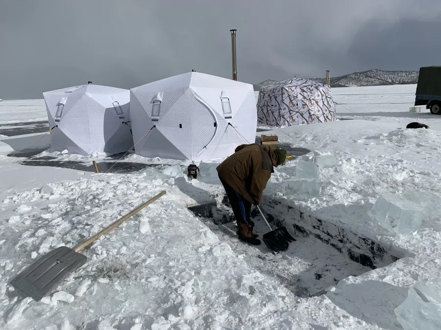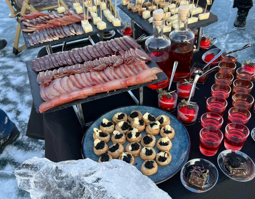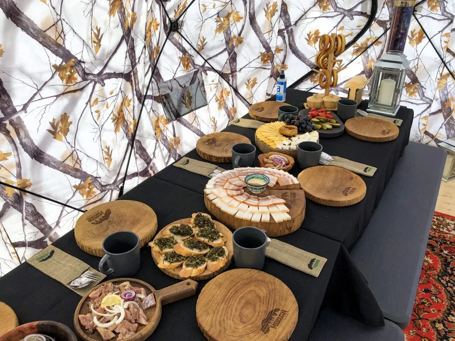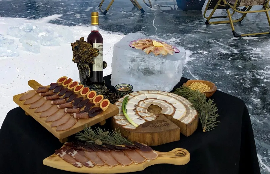 Для столовой мы нашли американскую палатку «Иглу», а для рыбалки «Хигаши». Отапливались газом, готовили тоже на газу, посуду использовали 50 на 50: половина — кемпинговая, металлическая; другая половина — фарфоровая и деревянная. Меню было простым: уха, копченая рыба, нарезки, овощи, несложные десерты. Для доставки гостей использовали катера на воздушной подушке, из развлечений коньки, рыбалка, дегустация домашних наливок в ледяных рюмках. Если отбросить сантименты, то собрали из того, что было.