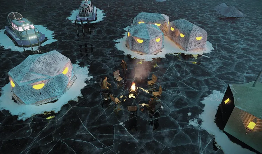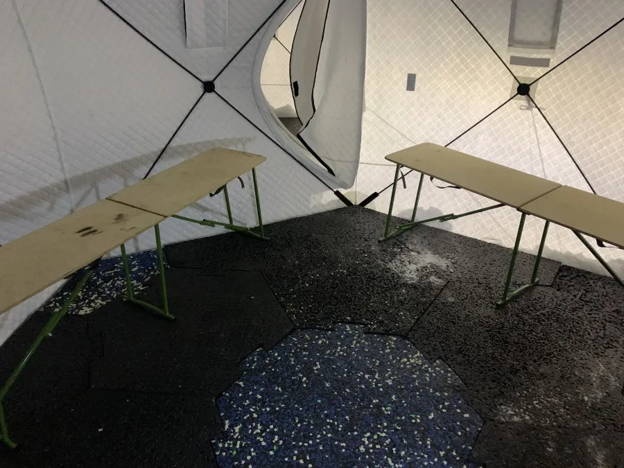 Во время тестирования мы не занимались растяжкой и ветровым укреплением палаток, пол собирали только частично, не было декора, посуды и текстиля. Только, чтобы надежно закрепить палатки требовалось вкрутить в лед 72 ввертыша и сделать 36 растяжек, на что ушло полдня. Расчистка площадки, заготовка дров, подготовка лунок для рыбалки, выпиливание майны, декорирование столовых — в городе эти задачи казались минутными, на месте на них уходили часы. На практике установка кэмпа с 0 до 100% заняла не 6 часов, как мы рассчитывали, а 22.