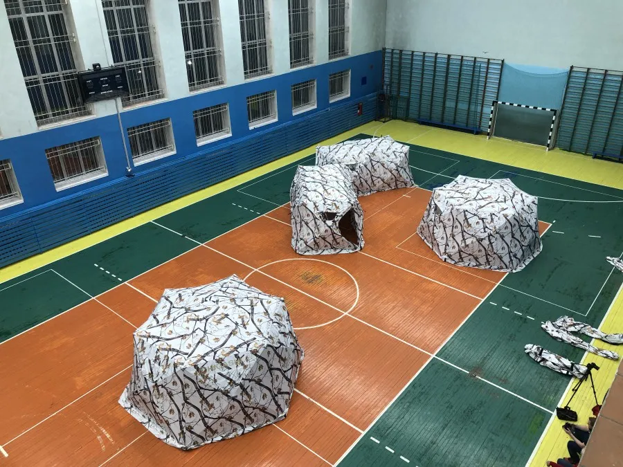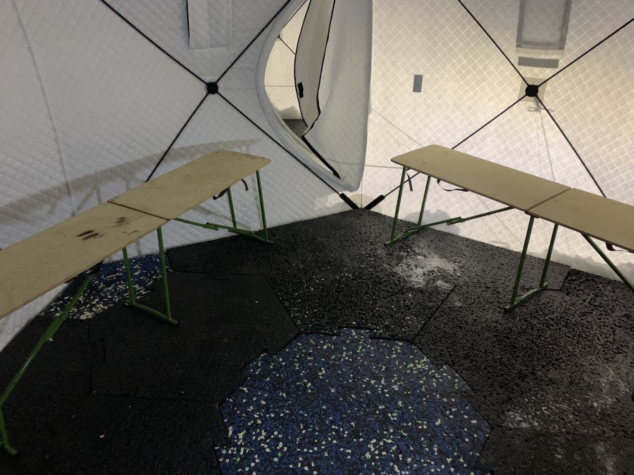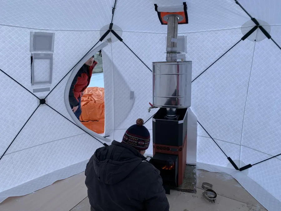 Когда нам доставили основной инвентарь, его требовалось протестировать. Для этого мы оборудовали под Ангарском небольшой полигон. В течение недели мы тренировались в сборке-разборке палаток, смотрели как ведут себя материалы при низких и высоких температурах. Основной задачей этого этапа была настройка отопления и подгонка полов. Под каждую палатку мы собирали свой дымоход, «обожгли» все печи, проработали их термоизоляцию, проверили время и уровень нагрева, продолжительность остывания помещений; замерили эффективность горения разных пород дерева и типов топливных брикетов.