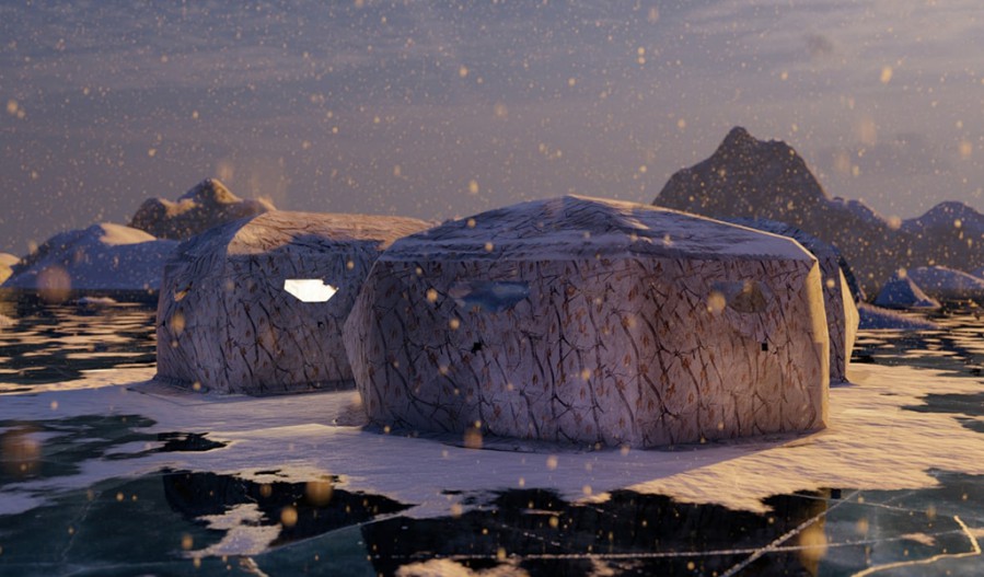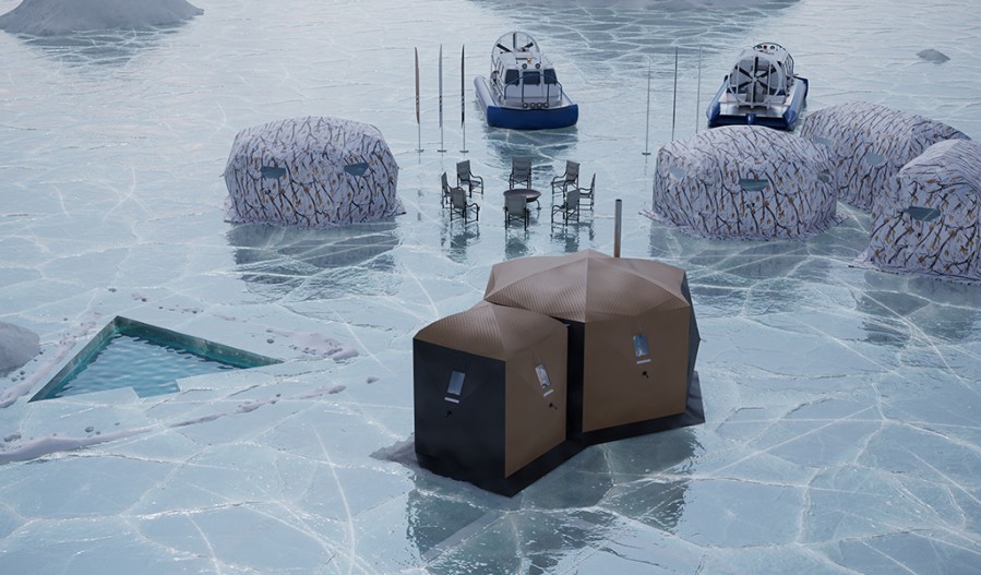 При проектировании кэмпа, мы сначала примеряли все на соответствие дизайну и той самой психологической философии, а уже следом оценивали это с практической точки зрения. Если сравнить рендеры, которые мы сделали на старте, с полученным результатом, то отличий практически не найти. Да, 90% работы в этом проекте — это погрузка-разгрузка, сборка-разборка, болты, гайки, веники и лопаты, но если не закладывать в его основу идею, то это будут просто палатки на льду.